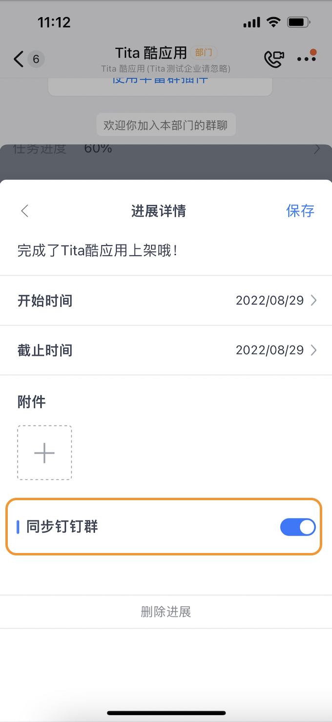 任务负责人在群里看到任务卡片后,就可以进行接受、拆解与更新等操作;点击【更新任务】可填写进度进展,并同步至钉钉群共享给大家;