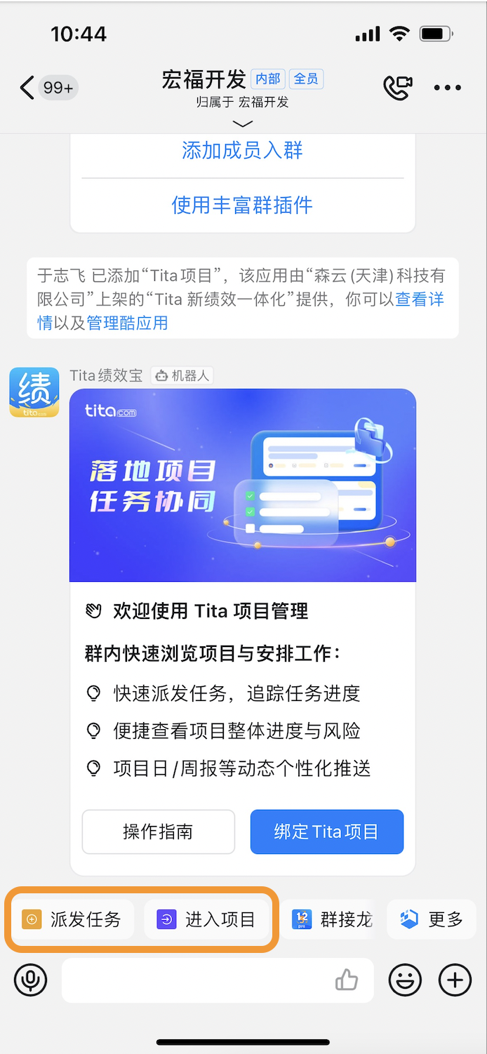 开通:钉钉的企业内部群中,群管理员可在【更多】中打开群应用安装入口,找到 Tita 绩效项目执行 点击【启用】,当机器人与群插件出现后就开通成功了。