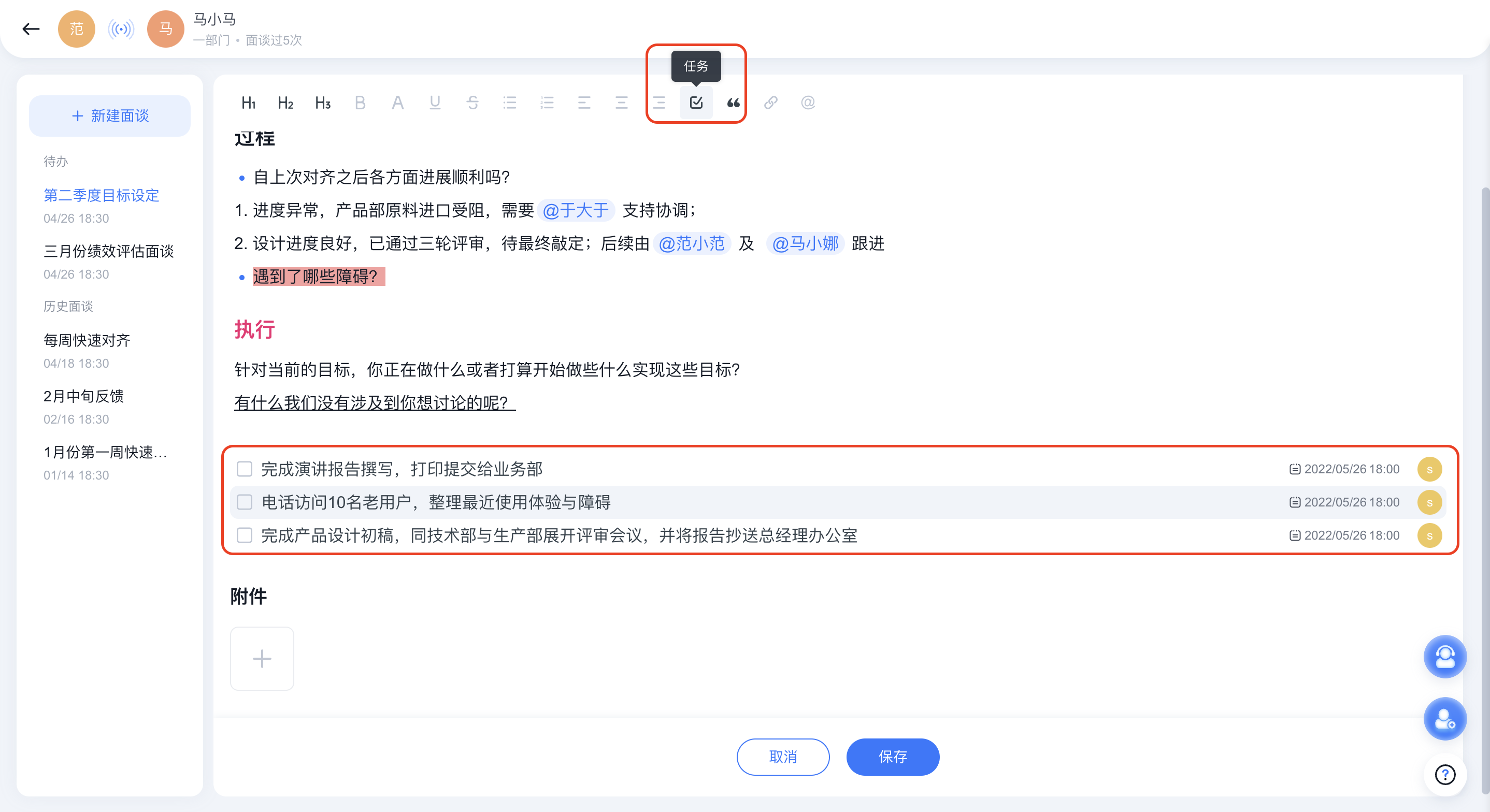 文本支持插入任务;例如我们「每月重点工作安排」的面谈中就可直接创建这个月的行动计划,并且同步至【行动计划】与【计划表中】,方便统计查看与执行