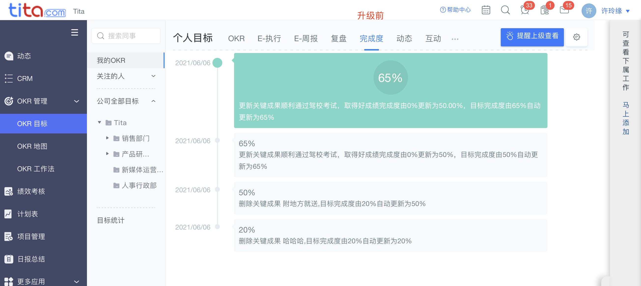 升级前:页签名称为「OKR」,在该页签下,可以在KR下添加任务及项目
