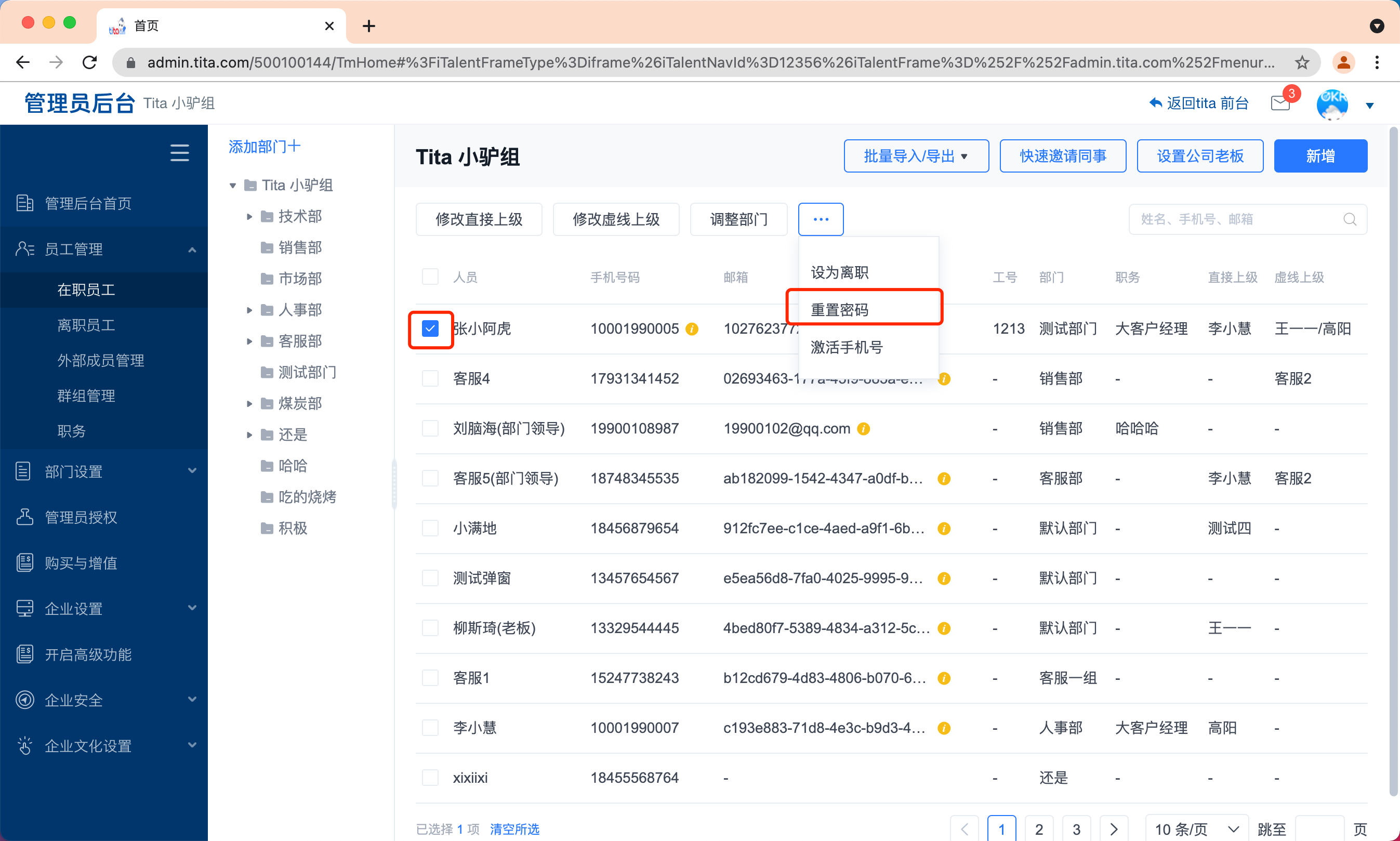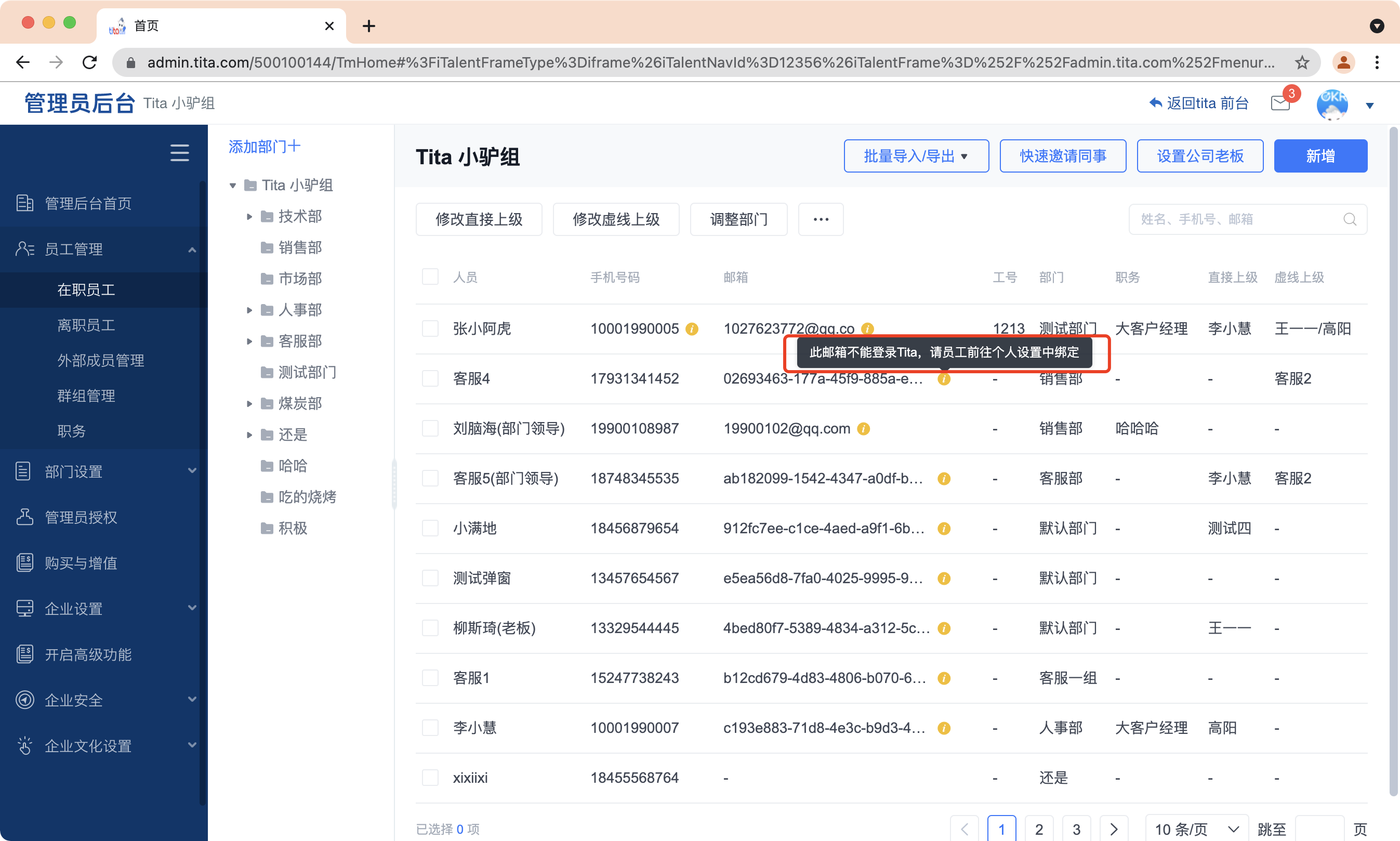 Tita 产品使用手册 注册与登录 如何激活邮箱作为登录账号? 管理员在后台在职员工列表如果发现了某位员工的邮箱后面呈现未激活的状态,那说明此邮箱不能作为tita账号登录如何解决?员工在【个人信息】页面重新修改绑定邮箱即可注意:员工在进行邮箱重新修改绑定的时候,需要填写密码验证身份,就是登录密码,这里需要管理员在初始化的时候为员工【重置密码】路径【企业管理后台——在职员工——重置密码】输入完密码之后,填写需要绑定的邮箱,获取验证码输入,即可完成绑定,此后就可以用邮箱作为tita的登录账号啦~管理员在后台在职员工列表如果发现了某位员工的邮箱后面呈现未激活的状态,那说明此邮箱不能作为tita账号登录如何解决?员工在【个人设置—账号设置】页面重新修改绑定邮箱即可注意:员工在进行邮箱重新修改绑定的时候,需要填写密码验证身份,就是登录密码,这里需要管理员在初始化的时候为员工【重置密码】路径【企业管理后台——在职员工——重置密码】输入完密码之后,填写需要绑定的邮箱,获取验证码输入,即可完成绑定,此后就可以用邮箱作为tita的登录账号啦~